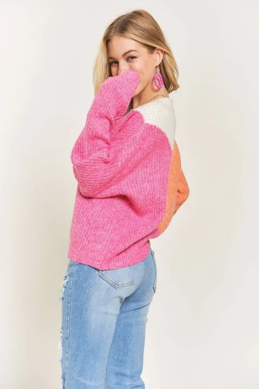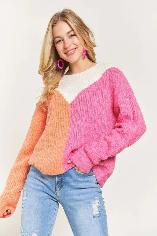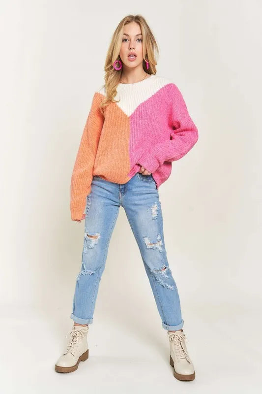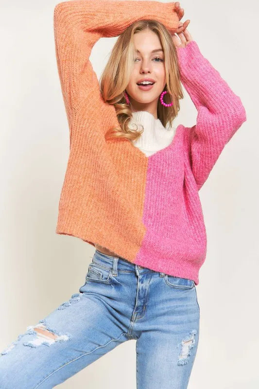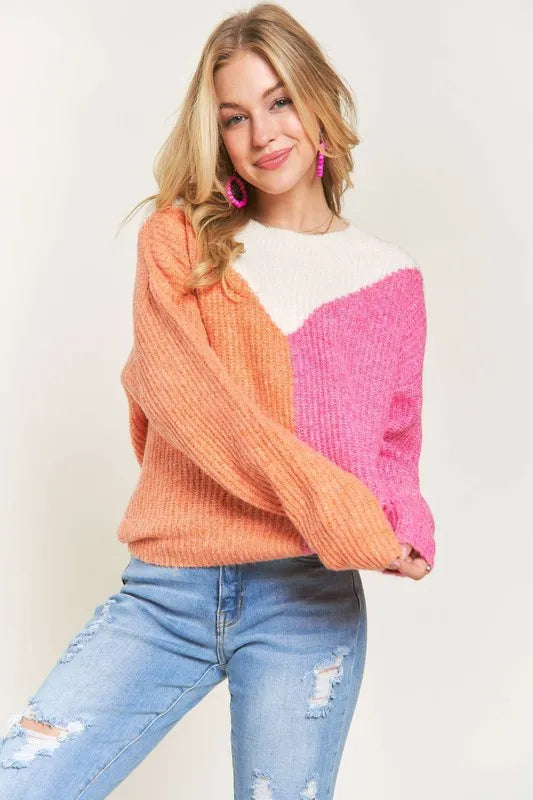 The colorblock comfy sweater top is a chic and cozy wardrobe essential. Featuring contrasting blocks of colors, this sweater top adds a modern and stylish touch to your outfit. The soft and comfortable fabric makes it perfect for everyday wear, providing warmth and comfort. Pair it with jeans or leggings for a casual yet fashionable look that is versatile and easy to style for any occasion.