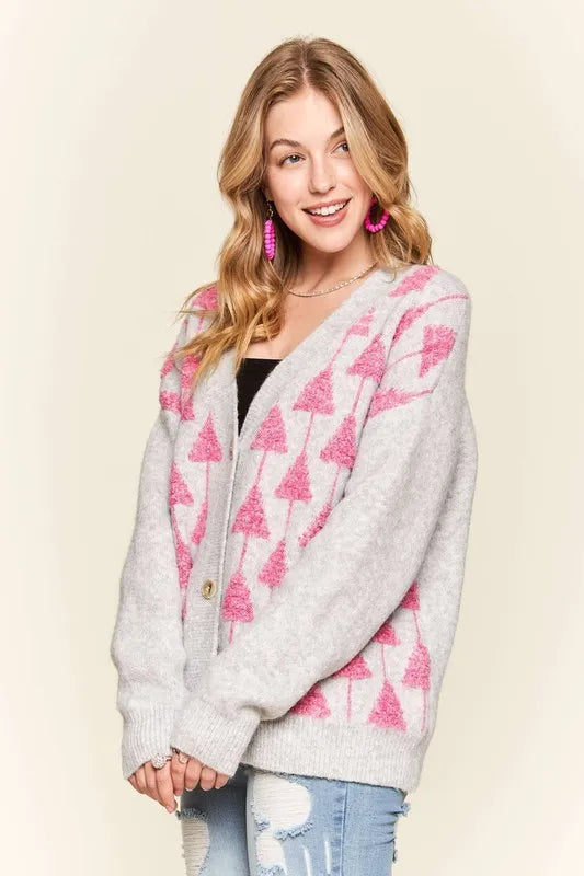 The fluffy tree accent cardigan is a cozy and whimsical addition to your wardrobe. With its fluffy texture and tree design accents, this cardigan adds a touch of fun and charm to any outfit. Perfect for layering over a simple top or dress, it will keep you warm and stylish during the colder months.