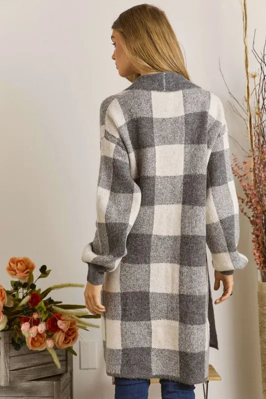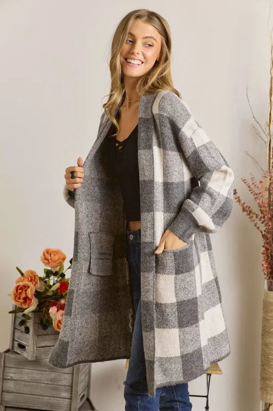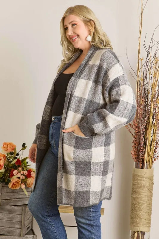 ADORA Full Size Checker Sweater Cardigan Plus Size