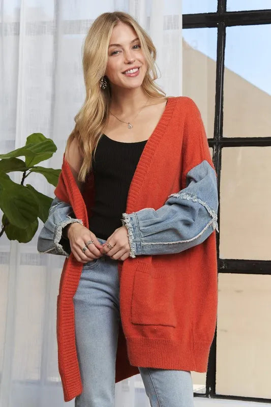 This sweater cardigan features unique frayed denim sleeves for a trendy and edgy look. The denim sleeves add a stylish and casual touch to the classic sweater cardigan silhouette. The frayed detailing gives the cardigan a cool and rugged aesthetic. Made with soft and cozy fabric, this cardigan offers both comfort and style for everyday wear. Elevate your wardrobe with this fashionable and versatile piece that effortlessly combines denim and knitwear for a chic and contemporary outfit.