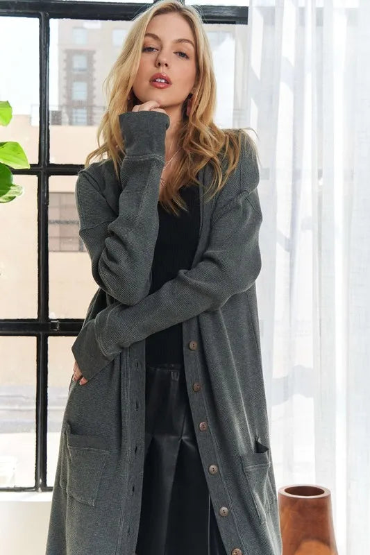 The Mineral Washed Hoodie Cardigan is a trendy layering piece with a vintage mineral washed finish. Combining the comfort of a hoodie with the style of a cardigan, it offers a casual and chic look. Perfect for adding a relaxed and fashionable touch to your outfit, this cardigan is a versatile and cozy choice for any occasion.