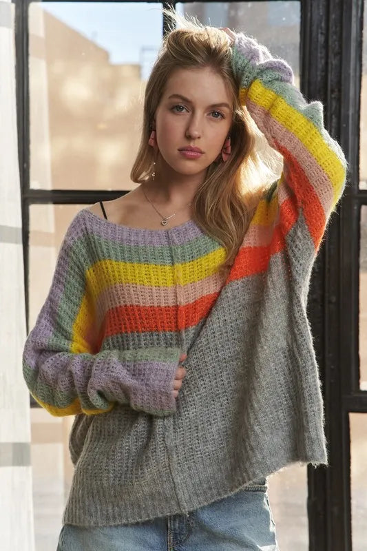 A multi-stripe sweater top is a fun and eye-catching piece that features multiple colorful stripes in various widths or orientations. This type of sweater is a great way to add a pop of color and personality to your outfit. You can style it with solid bottoms to let the sweater top be the focal point of your look, or you can mix it with other patterns for a bold and eclectic style. Whether you prefer a subtle mix of hues or a bright and bold combination, a multi-stripe sweater top is a versatile and trendy option for adding some flair to your wardrobe.