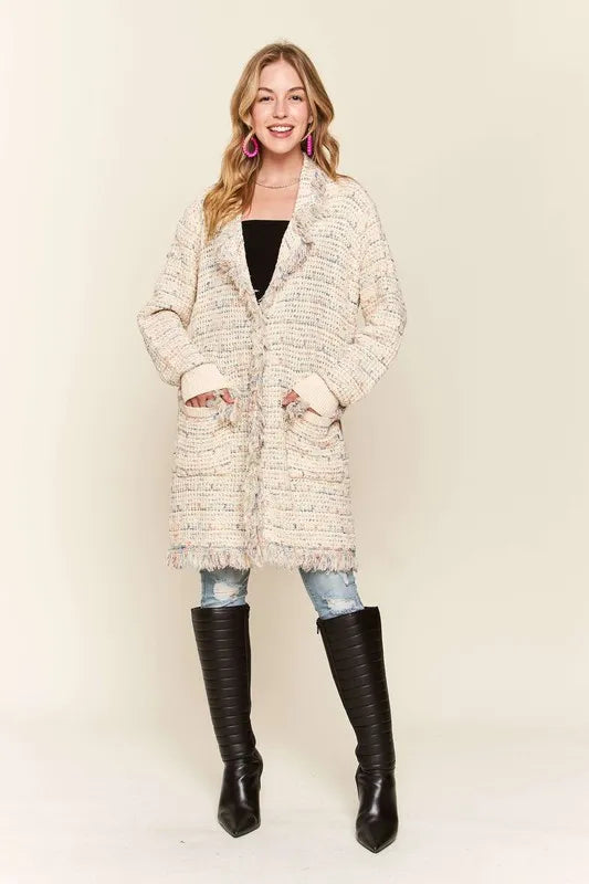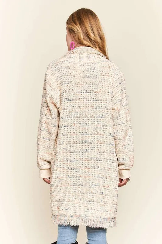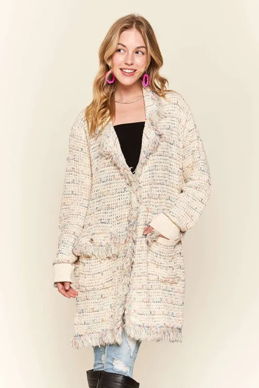 - Features: Oversized, Buttoned, Pocketed, Fringe