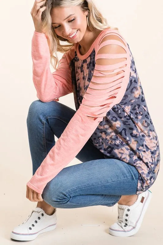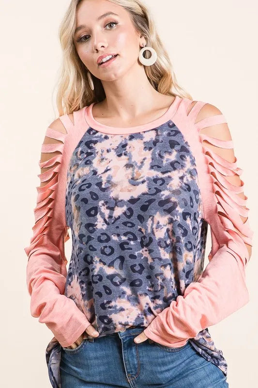 BiBi Tie Dye Leopard Burn Out Top with Contrast