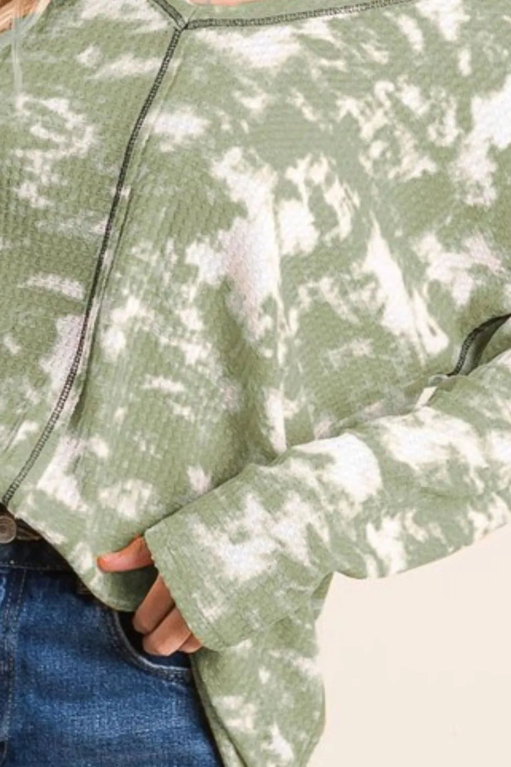 BiBi Tie Dye Print Waffle V Neck Top with Contrast