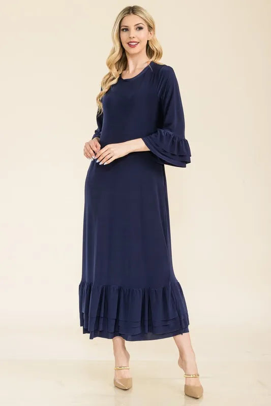 Celeste Full Size Modest Midi Dress with 3/4 Ruffle Bell Sleeves Plus Size