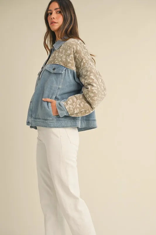 The quilted paisley print contrast denim jacket is a stylish and unique outerwear piece. It combines quilting, paisley print, and denim for a trendy look. This jacket adds flair and personality to any outfit.