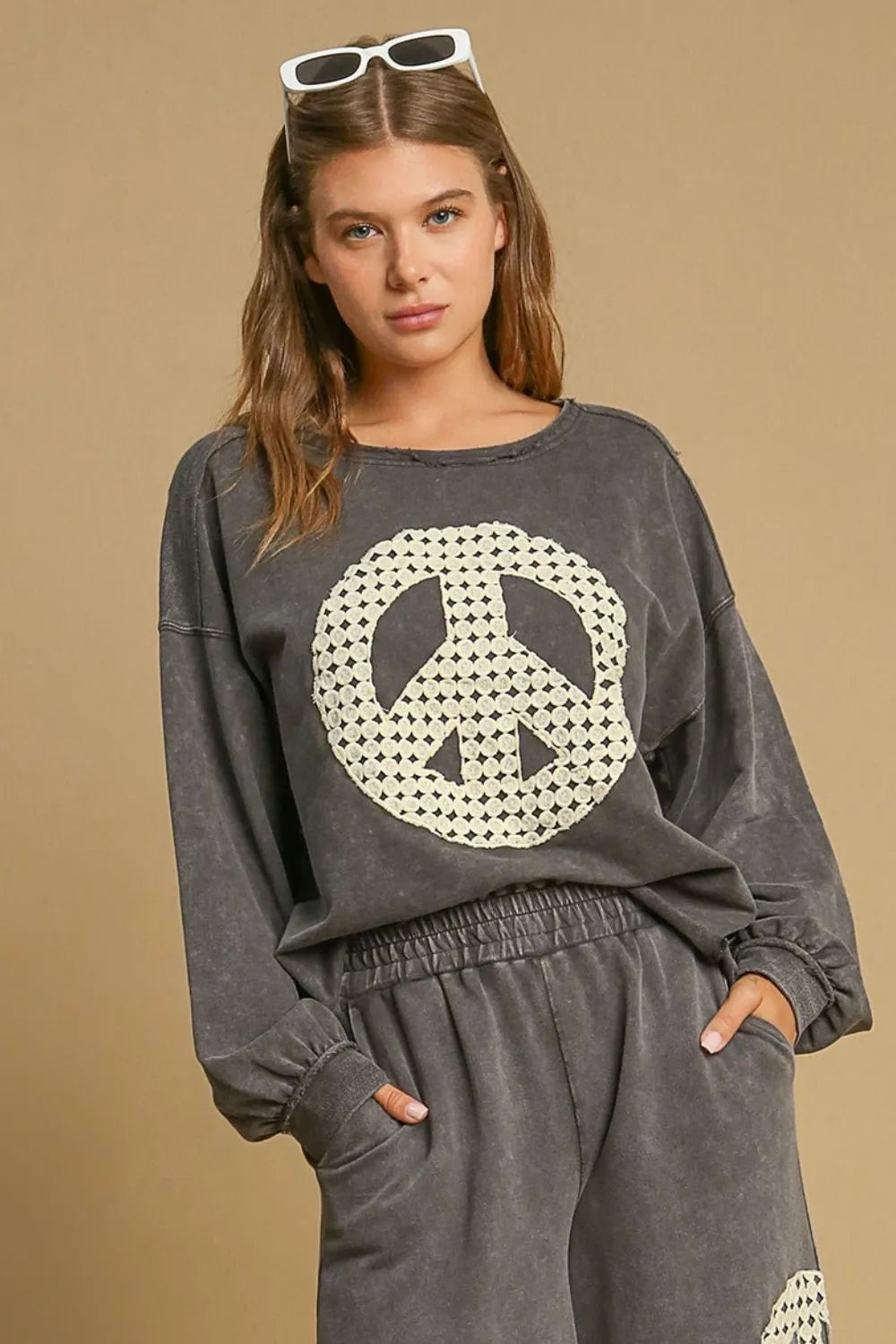 Peace Lace Applique Mineral Wash Sweatshirt is a unique and stylish addition to your wardrobe. This cozy sweatshirt features delicate lace applique detailing, adding a touch of elegance to your casual look. Crafted from high-quality mineral wash fabric, it offers both style and comfort for everyday wear. Elevate your loungewear collection with this fashionable and versatile sweatshirt.